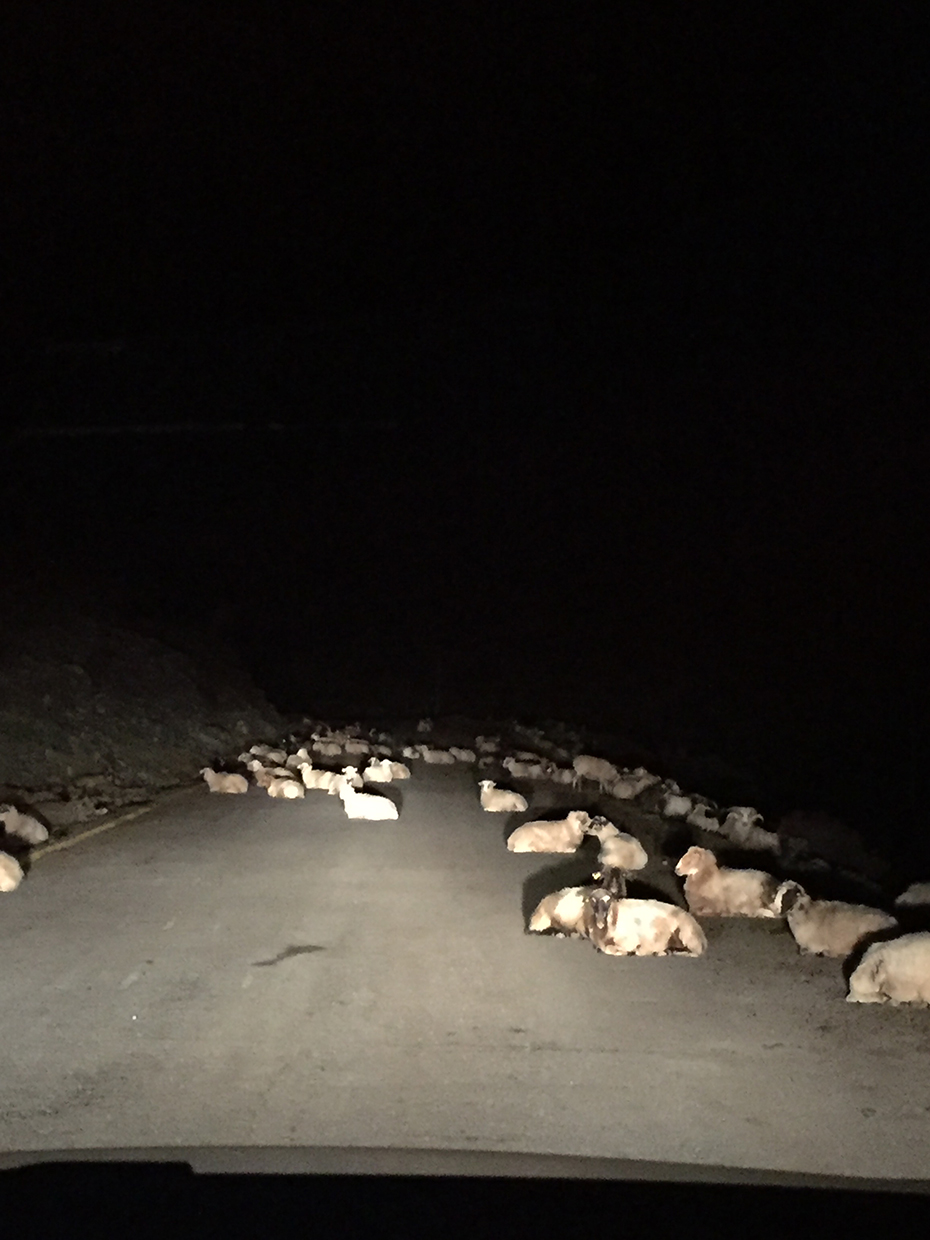 Ήταν τα πρόβατα. Διακόσια πρόβατα περίπου, με τα μάτια τους να γυαλίζουν στα φώτα του αμαξιού μας, εμποδίζοντας το δρόμο μας προς το σπίτι.