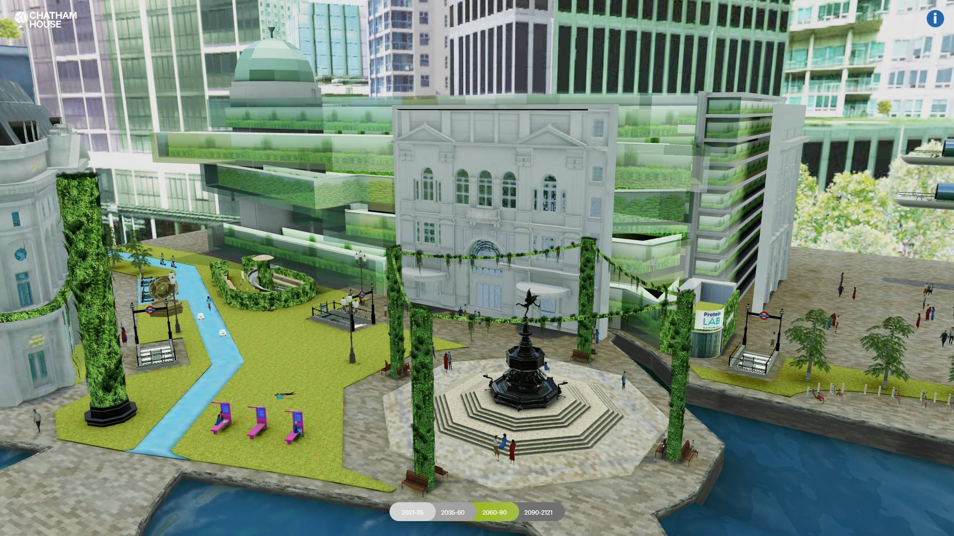 Από το κοινότοπο μέχρι το φαινομενικά φανταστικό, το Futurescape London, ένα project του Chatham House SNF CoLab, προσφέρει ένα συναρπαστικό, διαδραστικό όραμα για το πώς μπορεί να μοιάζει το Λονδίνο σε τέσσερα χρονικά σημεία, μέσα στα επόμενα εκατό χρόνια. Ο στόχος δεν είναι η ακριβής πρόβλεψη του μέλλοντος, αλλά η πυροδότηση μίας συζήτησης γύρω από μία πιθανή θετική εκδοχή του μέλλοντος για τις πόλεις, καθώς και για όλα όσα θέλουμε να επιτύχουν αυτές οι πόλεις.
