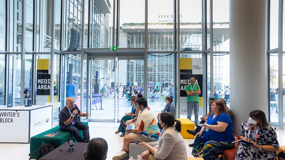 In addition to the first dedicated, onsite iMEdD Media Area for journalists at SNF Nostos, Media Table events gave journalists a chance to sit down for informal roundtable conversation with conference speakers. Here, Andreas fielded questions from representatives of a variety of news outlets, including popaganda.gr, on SNF’s grantmaking work and other timely societal issues.